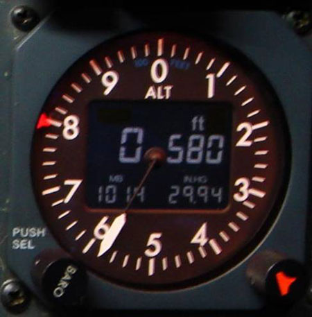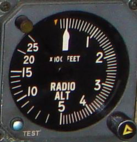 Le radioaltimètre (voir la photo 4) donne l'altitude de l'avion au-dessus du sol. L'aiguille d'altitude blanche se déplace en fonction d'une plage de 0 à 2500 pieds au-dessus du sol. Une échelle plus précise indique les altitudes de moins de 500 pieds au-dessus du sol pour aider à la vigilance de l'équipage à basse altitude.
