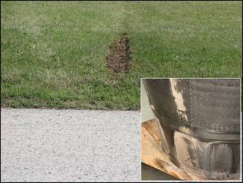 Après l'incident, le personnel de l'aéroport a inspecté la piste 06. L'inspection a révélé la présence d'une marque au sol longue de 12 pieds, dans le gazon après l'extrémité de piste, prenant naissance à quelque 44 pouces de la surface revêtue, et parallèle au cap de piste. La marque avait 9 pouces de largeur et 2 pouces de profondeur (voir la Photo 2) et elle avait été laissée par le carénage du vérin de l'inverseur de poussée et la tuyère du moteur numéro 2.