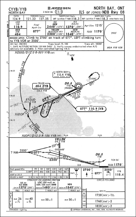 Au Canada, les procédures d'approche aux instruments sont établies en fonction des critères énoncés dans la publication de TC, Critères de construction des procédures aux instruments (TP 308). NAV CANADA est chargé de publier les cartes d'approche. Le TP 308 stipule qu'il faut considérer tout renvoi fait aux PANS-OPS (document 8168 susmentionné) dans les Annexes 4 et 15 de l'OACI comme étant un renvoi fait au TP 308. Toutefois, le TP 308 ne prescrit pas de créer des points de repère DME avec altitude pour les procédures NPA, et NAV CANADA ne les publie pas dans le Canada Air Pilot (CAP). Par conséquent, les cartes d'approche aux instruments Jeppesen pour le Canada ne donnent pas de points de repère altitude/distance dans leur profil latéral. Les cartes canadiennes de Jeppesen donnent un tableau servant à la descente et un profil de descente en approche finale, tandis que le CAP n'en donne pas.