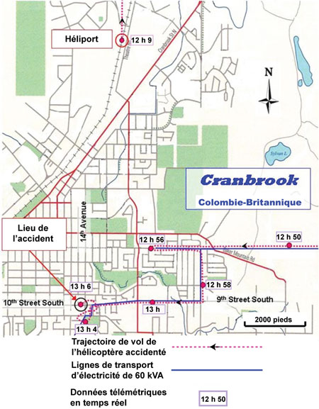 L'hélicoptère a décollé à 12 h 9Footnote 1 de l'héliport de l'entreprise Bighorn Helicopters Inc., au nord de la ville, et il a volé le long des lignes de transport d'électricité vers le nord-ouest de la ville. Il a refait le même trajet pour suivre les lignes vers l'est, puis s'est dirigé vers le sud. À 12 h 47, l'hélicoptère a viré vers l'ouest pour suivre les lignes vers un quartier résidentiel de la ville. À 12 h 58, l'hélicoptère se dirigeait vers le sud, en survolant la 30e avenue sudFootnote 2. Il a viré vers la droite pour suivre les lignes en direction ouest, au-dessus de la 9e rue sud. Quatre minutes plus tard, à proximité de la 10e rue et de la 14e avenue, l'hélicoptère a effectué plusieurs manœuvres à basse altitude (voir la photo 1 et l'annexe B – Carte de la ville de Cranbrook), et il semblait qu'on procédait à la vérification des lignes de transport d'électricité de la zone en question. Il volait en direction sud-sud-ouest au-dessus de la 14e avenue (à mi-chemin entre les 7e et 10e rues) à environ 120 pieds au-dessus du sol (agl) et à 25 nœuds lorsqu'il a perdu toute puissance moteur (voir la photo 2). L'hélicoptère a effectué une descente rapide; pendant les quelques dernières secondes de vol, l'appareil était ingouvernable et est tombé en chute libre d'une hauteur d'environ 85 pieds au-dessus du sol.