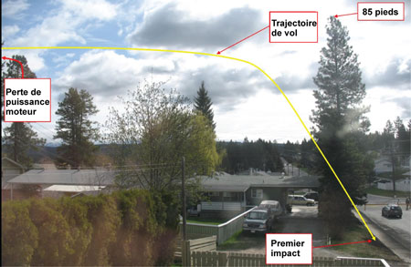 Sur le lieu de l'accident, les dernières secondes de vol se sont déroulées essentiellement face au vent dominant. L'hélicoptère a heurté le sol de la 10e rue sud qui était en pente douce, à environ 300 pieds à l'ouest de la 14e avenue sud. C'était surtout une zone à découvert, mais on y retrouvait plusieurs obstacles que le pilote a pu tenter d'éviter pendant sa descente. À l'est du lieu de l'écrasement se trouvaient deux grands conifères dont le plus haut s'élevait à environ 85 pieds. En outre, on y trouvait une série de lignes électriques résidentielles, orientée du nord au sud, ainsi qu'une résidence sous ces lignes (voir la photo 2). Compte tenu des positions et des déplacements relatifs de la voiture, de l'hélicoptère, du piéton et des arbres, il est fort peu probable que le pilote ait vu le piéton ou la voiture avant l'impact.