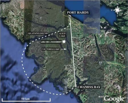 L'avion a décollé à 7 h 8. Après son décollage de Port Hardy, il s'est dirigé vers le sud pour suivre la trajectoire directe vers la baie Chamiss. Il n'y avait aucun nuage à l'altitude où évoluait l'avion sous le plafond. Plusieurs minutes plus tard, l'avion a survolé le lac Alice du côté ouest puis une crête s'étendant du nord-ouest au sud-est du côté est. Certains sommets des environs s'élèvent à plus de 2000 pieds. À l'approche de reliefs plus élevés, l'avion a entamé une montée graduelle, puis plus accentuée, pour traverser la crête couverte de nuages. Peu après, l'avion s'est mis en cabré prononcé; l'avion s'est mis à vibrer, l'aile gauche s'est inclinée et l'appareil s'est mis à descendre rapidement. Les ailes sont alors revenues à l'horizontale et le nez de l'avion a commencé à se redresser. Avant que le pilote ne puisse réduire la vitesse verticale de descente, l'avion a heurté la cime des arbres, et il s'est écrasé au sol sous un épais couvert forestier.