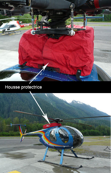 - La housse protectrice n'a pas été retirée avant le vol et elle s'est enroulée autour de la tringlerie des commandes de vol, elle a endommagé cette dernière et elle a rendu l'hélicoptère impossible à maîtriser.