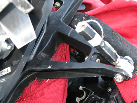 L'examen de l'épave de l'hélicoptère sur les lieux de l'accident a permis d'établir que la housse protectrice s'était enroulée fermement autour du système de commande rotor principal et autour du plateau oscillant (voir la photo 2). Presque toute la tringlerie (biellettes de changement de pas) était endommagée, et les dommages qu'elle avait subis ne correspondaient pas aux dommages habituellement causés par des forces d'impact lors d'un écrasement. D'après les dommages qu'ont subis les pales du rotor, ce dernier tournait à bas régime au moment de l'impact. Les dommages causés à l'arbre/les traces laissées sur les lieux de l'accident correspondaient à ceux subis lors d'une descente verticale avec un régime rotor nul.