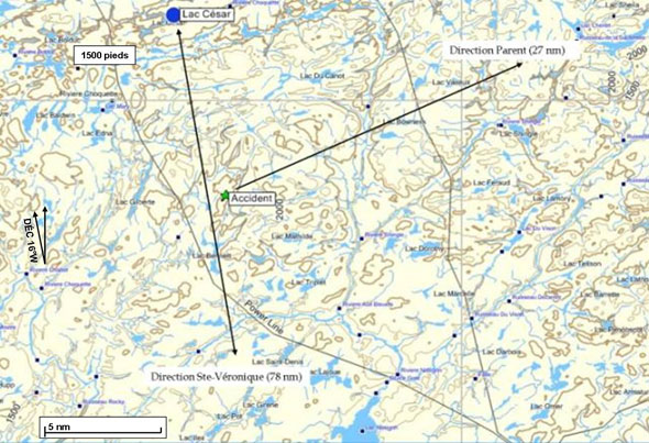 L'appareil a décollé de Sainte-Véronique vers 14 h 30 et s'est établi à une altitude de croisière variant entre 2600 pieds et 2700 pieds au-dessus du niveau de la mer (environ 600 pieds au-dessus du sol). Le pilote était très familier avec le parcours, l'ayant emprunté fréquemment. Aux environs du réservoir Mitchinamecus, soit à 30 nm de sa destination, les conditions météorologiques se sont détériorées au point où le pilote a été contraint de descendre. Une fois que l'avion a franchi la ligne électrique à la hauteur de la rivière Bazin, l'altitude de l'appareil et le plafond bas ne permettaient plus au pilote de traverser la chaîne de montagnes qui le séparait du lac César. L'option qui se présentait au pilote à ce moment-là était un des camps de la pourvoirie, situé sur le lac Gilberte, à proximité de sa position. Cependant, cet endroit était devenu inaccessible parce que le plafond ne permettait plus de franchir de nouveau la ligne électrique. (Voir Annexe A – Carte de la région survolée).
