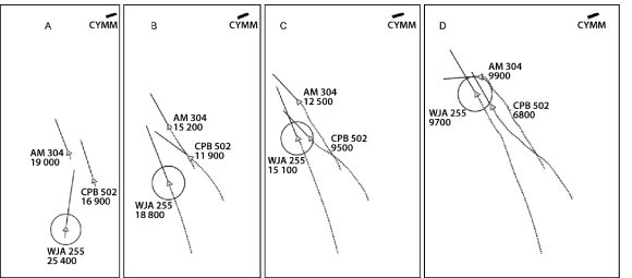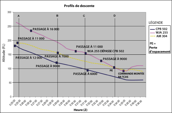 Le cercle autour de WJA255 représente cinq milles marins. La ligne de trajectoire prévue des trois avions représente la position des avions dans trois minutes, et l'altitude est exprimée en pieds au-dessus de la mer. Les lettres A, B, C et D correspondent aux zones apparaissant dans les profils de descente de l'annexe B.