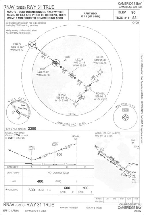 L'altitude de passage minimale publiée à LEXUP est de 800 pieds asl. La MDA au point de cheminement du seuil de piste est de 400 pieds asl. Si l'on utilise un taux de descente constant pour parcourir les 5 nm entre ces deux points de cheminement, il faut suivre un angle de descente de moins d'un degré. À 3,7 nm du seuil de piste, le point où C-FYEV a franchi les 500 pieds agl, la hauteur normale au-dessus du sol serait de 620 pieds agl. D'un point situé à 16 nm au nord de l'aéroport de Cambridge Bay, le temps nécessaire pour effectuer une approche complète aux instruments en passant par le point de cheminement SEDIXFootnote 17 à une vitesse-sol de 120 nœuds aurait été d'environ quatre minutes de plus que le temps nécessaire pour se rendre directement à LEXUP, puis au seuil de la piste 31 vrais.