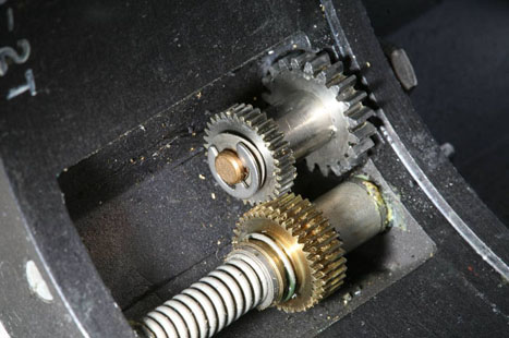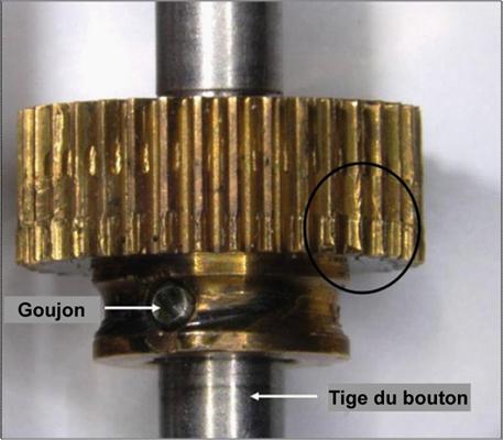 Un mauvais alignement de l'engrenage d'entraînement, causé par la tige du bouton faussée, combiné au jeu sur les plans radial et axial ont provoqué un mauvais engrènement de l'engrenage d'entraînement et du train d'engrenage à aiguille (référence 24593), ce qui a usé de façon anormale et endommagé l'engrenage, référence 24319; on constatait des marques de frottement, d'usure avancée et de séparation des pointes de cinq dents (voir l'Annexe C – Engrenage endommagé de l'altimètre no 1).