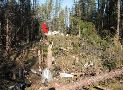 Les renseignements tirés des arbres heurtés et de l'épave indiquent que l'avion est entré en collision avec les arbres sur un relief ascendant dans une assiette quasiment horizontale (voir la photo 1). Sur les quelque 150 premières verges du contact avec les arbres, l'avion n'en touchait que la cime, puis il a endommagé et fauché de nombreux arbres sur les 150 verges suivantes avant que son fuselage restant ne s'immobilise (voir la photo 2). Le sillon laissé par l'épave était orienté selon un cap magnétique de 340 degrés, ce qui indique que C-GFIT s'éloignait du village de Cat Lake au moment de l'impact. L'épave était située à une altitude d'environ 1460 pieds asl.