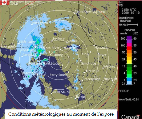 Quoique le système météorologique formait initialement une ligne qui se prolongeait du nord au sud, il se déplaçait de l'ouest vers l'est. Il s'étendait à partir d'un endroit du sud-ouest de l'Ontario jusqu'au nord de Sudbury (voir l'annexe A). La plus forte concentration de précipitations se trouvait en avant, là où il n'y avait pas de station d'observation météorologique. Un mélange de pluie, de neige et de vents forts s'ajoutait aux conditions. Pendant que le front se déplaçait vers l'est, il a commencé à changer de forme et semblait plus convexe. Cela signifie que les conditions météorologiques aux extrémités n'étaient pas aussi sévères et que tout bulletin d'information météorologique ne reflétait pas les conditions réelles auxquelles le pilote a probablement fait face (voir l'annexe B).