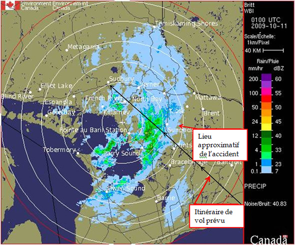Le radar météorologique de Sudbury affichait de faibles signaux vers l'ouest, ce qui indiquait des averses de pluie isolées. Le FIC de London a également fourni l'observation météorologique abrégée de Gore Bay et de divers aéroports situés à l'ouest de Sudbury. Le FIC de London avait mentionné que les conditions météorologiques de Sudbury à l'arrivée s'annonçaient favorables, et les précipitations, s'il y en avait, seraient très faibles.