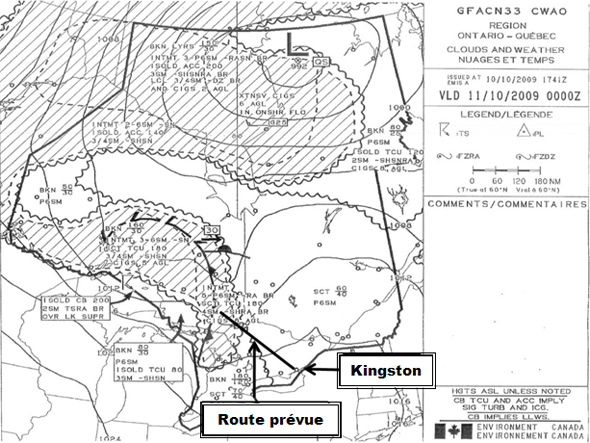 Le front froid se déplaçait vers l'est à 30 nœuds, en doublant sa vitesse mentionnée dans la GFA précédente. On avait estimé qu'il arriverait dans la région de Sudbury à peu près en même temps que l'avion. Le front froid ayant déjà traversé Sault-Sainte-Marie, on avait relevé l'information suivante : un plafond à 800 pieds agl et une visibilité de 3 sm dans des averses de neige.