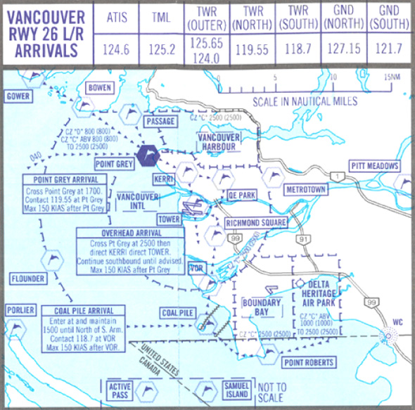 À 21h57Footnote 1, alors qu'il se trouvait à 20 milles marins (nm) au sud de l'aéroport et à 1500 pieds au-dessus du niveau de la mer (asl), l'équipage d'APEX 511 a communiqué pour la première fois avec la tour de Vancouver. L'avion faisait alors partie d'un groupe de 4 appareils en rapprochement de Vancouver, les 3 autres étant des Airbus plus gros sous le contrôle du contrôleur des arrivées de Vancouver. Le premier entrait en étape de base à gauche en provenance du sud-est et les 2 autres arrivaient en ligne droite de l'est. Le contrôleur d'aéroport de la tour de Vancouver a demandé à l'équipage d'APEX 511 de suivre la route d'arrivée selon les règles de vol à vue (VFR) Coal Pile publiée pour la piste 26R (voir l'annexe A).