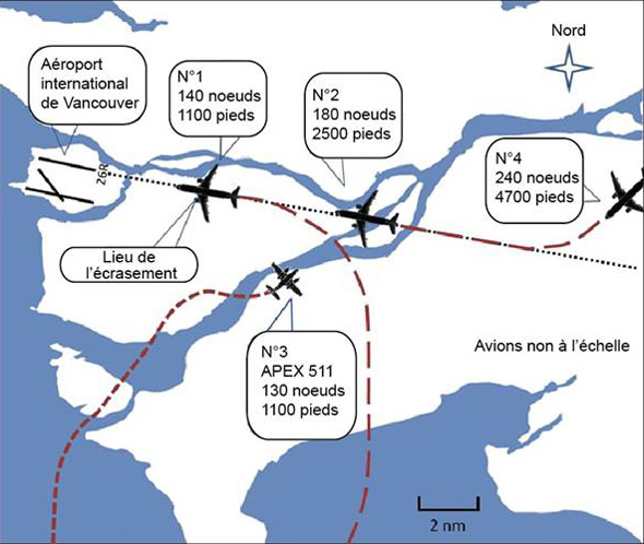 À 22h1, la tour de Vancouver a informé APEX 511 qu'il serait le deuxième ou le troisième avion en approche (voir la figure 1). À 22h2, APEX 511 a survolé le VOR (radiophare omnidirectionnel à très haute fréquence) de Vancouver, 7 nm au sud de l'aéroport, à 1500 pieds asl, en se dirigeant au nord-ouest vers un point de repère situé à environ 2 nm au sud-est de l'aéroport. Après avoir survolé le VOR, APEX 511 est descendu à 1000 pieds asl. À 22h3, APEX 511 a été avisé qu'il serait le troisième avion, derrière un Airbus. Le contrôleur d'aéroport a donné l'instruction à APEX 511 de prolonger son approche vers l'est, en vent arrière, et a émis un avertissement de turbulence de sillage en précisant la position de l'avion à suivre. L'équipage d'APEX 511 a demandé au contrôleur d'aéroport s'il devait effectuer un virage à 360°. Le contrôleur d'aéroport lui a confirmé d'élargir son approche vers l'est et de suivre l'avion lorsqu'il serait en vue.