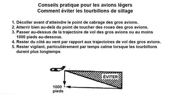 Turbulence de sillage – La turbulence de sillage se fait surtout sentir au départ et à l'arrivée. Il ne faut toutefois pas prétendre qu'elle se présente uniquement à proximité des aérodromes. La prudence est de mise lorsqu'un vol est effectué n'importe où derrière un gros aéronef et à moins de 1 000 pi en dessous de ce dernier. […] De plus, malgré ces mesures, l'ATC ne peut garantir l'évitement des turbulences de sillage.