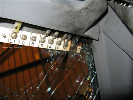 Une bille de métal fondu a été trouvée sous le bornier. Elle était noyée dans une section de verre qui avait fondu au-delà de l'épaisseur de la couche de verre.
