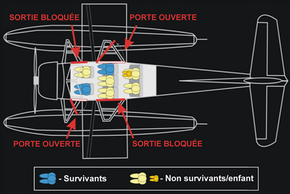 La ceinture de sécurité de 4 des passagers adultes était détachée. Ils n'ont pas pu sortir de l'hydravion et se sont noyés. La figure 2 montre l'emplacement des sièges, les portes qui étaient ouvertes ainsi que celles qui étaient bloquées.