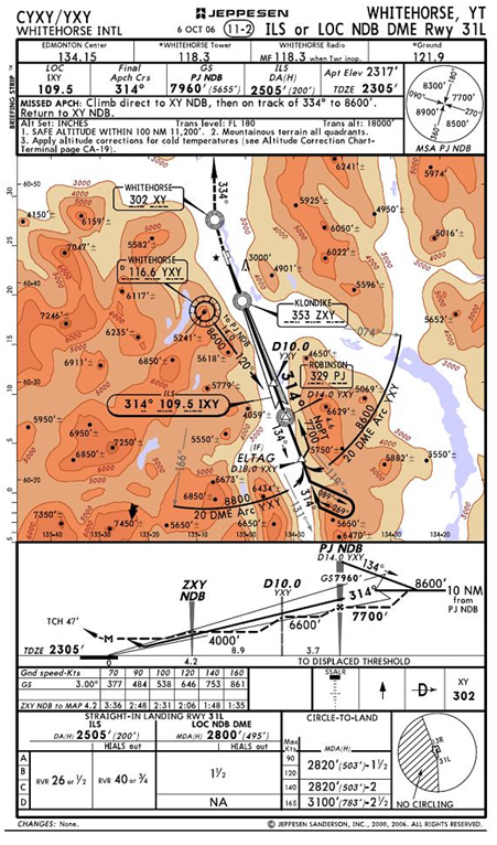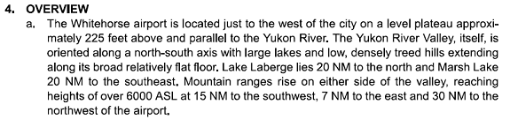 L'aéroport est situé dans une vallée et est entouré de tous côtés par des montagnes qui s'élèvent jusqu'à environ 4000 pieds au-dessus de l'altitude de l'aéroport vers l'est et à plus de 5000 pieds vers l'ouest. La distance entre ELTAG, le repère intermédiaire, et le seuil de la piste est de 21,4 milles et la différence d'altitude entre le point d'interception de la trajectoire de descente et la piste est de 6295 pieds (angle de trajectoire de descente de 3,0 degrés). En ce qui concerne la longueur d'approche et la différence d'altitude, l'approche ILS de la piste 31L à Whitehorse n'est pas une approche standard. Le repère d'approche finale est le radiophare Robinson, qui est situé à 16,8 milles du seuil de la piste. Lorsque l'on maintient une vitesse d'approche de 140 nœuds, il faut environ 9 minutes pour compléter l'approche à partir du repère d'approche finale.