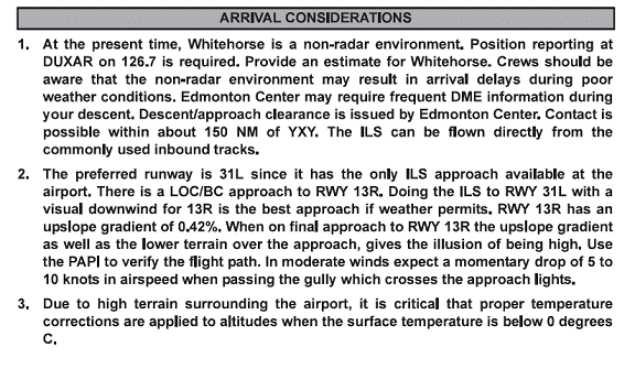 À certains égards, l'équipage de conduite considérait l'approche vers Whitehorse comme s'il s'agissait d'une approche contrôlée au radar. En effet, dans un environnement radar, les équipages de conduite ne fournissent pas normalement de rapport de position et d'ETA, sauf si le contrôleur en fait la demande. Par conséquent, l'équipage de conduite n'avait pas conscience de l'importance du compte rendu de position à 10 milles en finale comme indice pour le contrôleur aérien de relève qu'il était temps de demander aux camions de libérer la piste et d'émettre l'autorisation d'atterrissage.