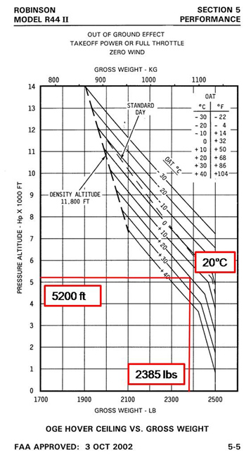Le moteur développait toute la puissance disponible et il n'y a eu aucun problème de commandes de vol d'ordre mécanique durant l'événement. Les tableaux des performances dans le manuel d'utilisation de l'hélicoptère indiquent qu'à 2 835 livres, 20 °C, aucun vent et un régime rotor principal de 100 %, l'altitude-pression maximale pour un vol stationnaire hors effet de sol est de 5200 pieds (voir l'annexe A). L'altitude-pression maximale d'un vol stationnaire en effet de sol dans les mêmes conditions est de 8760 pieds; donc, il existe une grande différence dans la puissance nécessaire entre un vol stationnaire en effet de sol et un autre qui ne l'est pas. L'altitude-pression à la zone d'atterrissage était de 5100 pieds, ce qui ne laissait que 100 pieds de jeu à l'hélicoptère pour le vol stationnaire hors effet de sol.