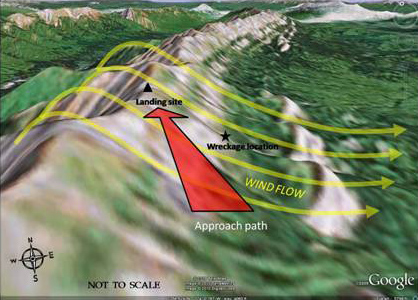 Après avoir survolé la crête alors qu'il se dirigeait vers sa destination, l'hélicoptère a viré pour effectuer une approche à faible pente à 60 degrés par rapport à la crête. L'approche à faible pente faisait partie de la technique recommandée. Cependant, la trajectoire d'approche du côté sous le vent de la crête exposait l'hélicoptère aux courants descendants proches de la crête. Alors que l'hélicoptère ralentissait et quittait la vitesse de portance de translation avant d'arriver en effet de sol au-dessus de l'étroit sommet de la crête, le pas du rotor et la puissance du moteur ont dû être augmentés de façon importante. Même dans des conditions de vent idéales, l'hélicoptère avait peu de jeu pour se mettre en vol stationnaire hors effet de sol, donc sa capacité en la matière était encore plus réduite dans des courants d'air descendants.
