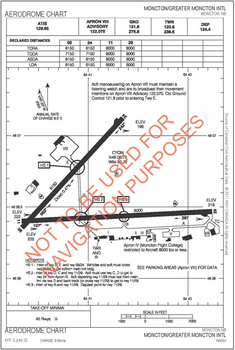 À CYQM, l'aéroport possède 2 pistes en asphalte (voir l'annexe C). La piste 06/24 est longue de 6150 pieds et large de 200 pieds. La piste 06, qui présente une pente descendante de 0,47 %, est desservie par une approche de précision à l'ILS. La hauteur de décisionFootnote 4 de l'approche à l'ILS de la piste 06 est fixée à 425 pieds asl, soit 200 pieds agl. La piste 11/29 est quant à elle longue de 8000 pieds et large de 200 pieds, et elle est desservie par une approche de non précision en navigation de surface (RNAV) et au radiophare non directionnel (NDB). L'altitude minimale de descente (MDA) de l'approche RNAV de la piste 11 est de 600 pieds asl, ce qui correspond à 369 pieds agl. La MDA de l'approche au NDB de la piste 11 est de 660 pieds asl, ce qui équivaut à 429 pieds agl. Les deux pistes ont une bande d'extrémité de piste en dur longue de 60 mètres. Aucune des pistes à CYQM ne possède une surface rainurée ou une aire de sécurité d'extrémité de piste (RESA), ce qui ne contrevient toutefois pas à la réglementation.