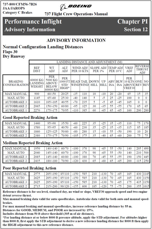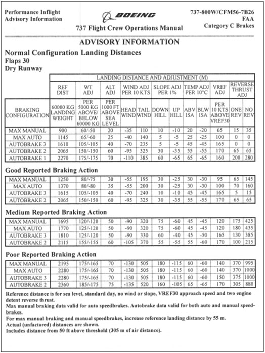 Dans les manuels de nombre de ses nouveaux avions, Boeing inclut des données consultatives en plus des données certifiées. Ces tableaux, qui se basent sur des distances d'atterrissage non pondérées sur piste sèche, apportent un certain nombre de petites corrections à la distance d'atterrissage destinées à tenir compte de la configuration du freinage, de la masse, du vent, de la pente de la piste, de la température, de la vitesse au toucher des roues, des inverseurs de poussée et de la qualité du freinage signalée. Un exemple d'une page de données consultatives du Boeing 737-800 figure dans le manuel d'exploitation de l'équipage de conduite (FCOM) de cet avion (voir l'annexe D). Pour respecter les exigences des JAA/JAROPS, les données consultatives de ces pages prévoient une marge de sécurité additionnelle de 15 % ajoutée à toutes les distances d'atterrissage sur piste mouillée ou glissante (à savoir lorsque la qualité du freinage signalée est bonne, moyenne ou mauvaise) (voir l'annexe E).