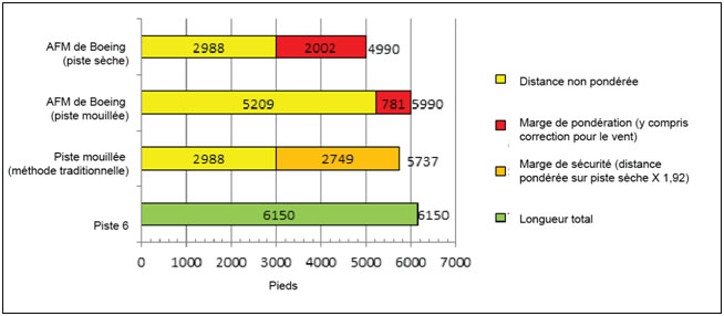 Dans le présent événement, la distance d'atterrissage pondérée sur piste mouillée tirée de l'AFM de Boeing pour le Cargojet 620 était de 5990 pieds, ce qui se situe dans les limites de régulation pour une piste 06 mouillée qu'exige le paragraphe 705.61(1) du RAC; toutefois, ce résultat correspond à plus de 97 % de la distance d'atterrissage totale disponible. Dans le cas du B727-200, la distance d'atterrissage pondérée sur piste mouillée avait été établie dans le cadre d'essais en vol réels, en plus de comprendre une marge de sécurité de 15 %. Une fois que cette marge de sécurité de 15 % appliquée par Boeing à des fins de certification est ôtée du résultat pondéré, cela donne une distance d'atterrissage non pondérée sur piste mouillée de 5209 pieds. La méthode utilisée par Boeing pour déterminer la distance d'atterrissage pondérée sur piste mouillée donnait en fin de compte une marge de sécurité plus grande en cas d'atterrissage sur piste mouillée que la méthode traditionnelle consistant simplement à appliquer un facteur de pondération de 1,92 à la distance d'atterrissage non pondérée sur piste sèche (5737 pieds). Malgré cette marge de sécurité accrue, la distance d'atterrissage pondérée sur piste mouillée n'offrait pas une marge de sécurité suffisante dans les présentes circonstances, et ce, à cause d'un toucher loin sur la piste, d'une vitesse de toucher plus élevée que la normale, d'une piste en pente légèrement descendante et contaminée par de l'eau stagnante. Ces différences représentent plusieurs des variables qui, jusqu'à un certain point, peuvent généralement se retrouver dans de nombreux atterrissages. Dans le présent événement, l'effet combiné de ces variables a eu tôt fait de gruger la marge de sécurité de 15 pour cent prévue dans la distance d'atterrissage pondérée sur piste mouillée. C'est pourquoi il ne restait plus assez de piste pour que l'équipage de conduite des Cargojet 620 puisse immobiliser l'avion avant sa sortie en bout de piste à une vitesse de 50 KIAS.