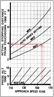 Le manuel d'exploitation du Boeing 727-200 renferme également un graphique des véritables distances d'arrêt s'appuyant sur les performances sur piste sèche. Ce graphique, qui n'accorde aucun crédit à l'inversion de poussée, sert, pour les aéronefs équipés de freins automatiques, de guide pour établir quel réglage des freins automatiques convient le mieux à l'atterrissage.