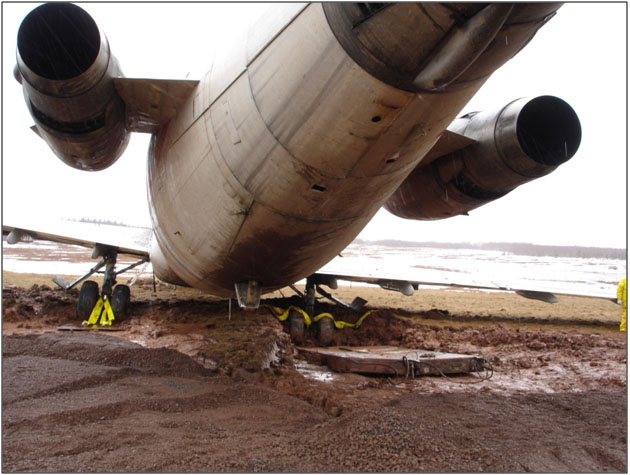 En 2004, un Boeing 727-200 qui se posait sur la piste 29 à CYQM est parti en aquaplanage à l'atterrissage et a quitté la piste à l'intersection avec la voie de circulation CharlieFootnote 75. Dans cet événement, qui s'est produit de jour, les conditions météorologiques signalées juste avant l'incident faisaient état d'une légère pluie et de brume. Toutefois, de la pluie forte était tombée au cours des 30 minutes précédentes. Avant l'atterrissage de l'avion en question, l'équipage d'un autre appareil avait transmis un message de pilote (PIREP) pour signaler la présence d'eau stagnante sur la piste et une qualité de freinage de l'avion allant de passable à mauvaise. De plus, le personnel d'entretien de l'aéroport avait signalé la présence, sur toutes les surfaces de l'aéroport, d'une couche d'eau stagnante pouvant atteindre une hauteur de ¼ pouce (6,35 mm). L'inspection de l'avion en question a révélé des dommages sous forme de dévulcanisation du caoutchouc qui pouvaient s'expliquer par un aquaplanage. Peu après, il y a eu publication d'une observation météorologique spéciale faisant état de forts orages et de forte pluie.