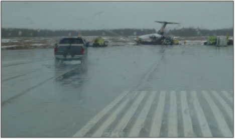Une fois les moteurs de l'avion coupés et les pompiers arrivés sur place, de l'eau stagnanteFootnote 2 était visible sur la piste 06 (voir la photo 2). Rien n'indiquait la présence de glace ou de neige fondante.