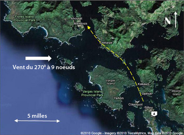 Les conditions météorologiques rapportées à Tofino étaient les suivantes : vent du 270° vrai (V) à 9 nœuds, visibilité de 8 milles terrestres, couche de nuages épars à 1000 pieds au-dessus du sol (agl), ciel couvert à 1400 pieds agl, température de 11 °C et point de rosée de 8 °C. Au moment de l'accident, aucun plan d'eau miroitant ni courant d'air descendant n'avait été signalé le long de la route suivie par le vol en question. Ce vol d'une durée de 6 minutes (voir la figure 1) se fait normalement à une altitude comprise entre 300 et 500 pieds au-dessus du niveau de la mer (asl).