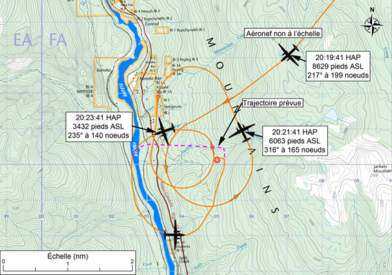 Il devait alors effectuer un virage à gauche en finale qui exigeait un changement de direction de plus de 90° à un angle d'inclinaison pouvant aller jusqu'à 40°. Il devait ensuite descendre de 900 pieds dans le ravin pour effectuer le largage. Après chaque largage, il devait continuer en ligne droite en survolant le relief en pente descendante du ravin en direction du fleuve Fraser.