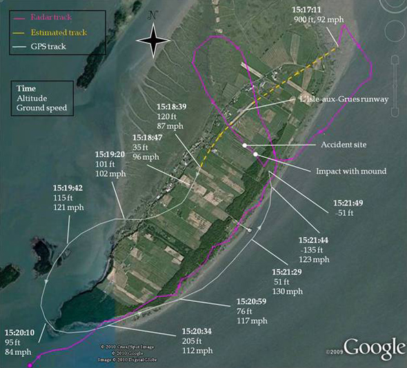 L'appareil poursuit son vol en suivant la rive sud de L'Isle-aux-Grues en vue d'effectuer le circuit pour la piste 25 (voir l'annexe A, trajectoire GPS et radar)Note de bas de page 2. À la hauteur de l'aéroport, le Cessna effectue une boucle au-dessus de la piste avant d'entreprendre le parcours vent arrière gauche. À environ 1 nm au nord-est du seuil de la piste, l'appareil commence le parcours de base. À 15 h 17, il disparaît de l'écran radar au moment où il amorce l'approche finale à 1 nmde la piste et 900 pieds asl.
