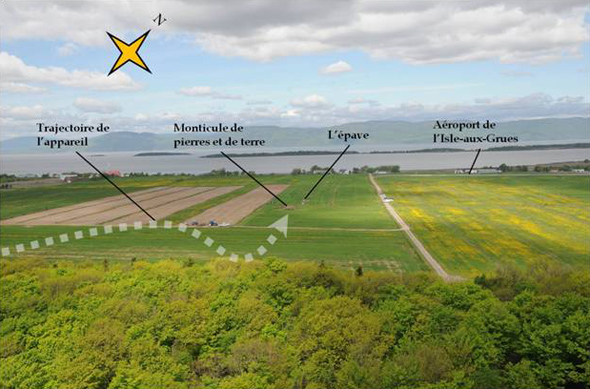 L'appareil a heurté un monticule de pierres et de terre d'une hauteur de 8 pieds et d'une largeur de 30 pieds situé à quelque 2000 pieds au sud de la piste. C'était la seule élévation de terrain dans les environs de l'accident. Le monticule était partiellement recouvert d'herbe et de petits arbustes. Le Cessna 172 volait sur un cap de 325 degrés magnétiques au moment de la collision. Les premières marques d'impact indiquent que le train d'atterrissage du C-FEAR a percuté le monticule à environ 5 pieds de sa base. Les ailes étaient horizontales ou presque. Deux marques d'hélices espacées d'environ 14 pouces ont été relevées dans le monticule. Après le choc, le C-FEAR s'est en partie disloqué. L'avion a été emporté dans son élan avant de s'écraser sur le dos dans un fossé, à 255 pieds du point d'impact initial. L'impact a provoqué un incendie. On n'a relevé aucun signe de dommages liés à un incendie antérieur à l'impact.