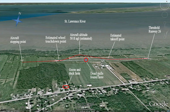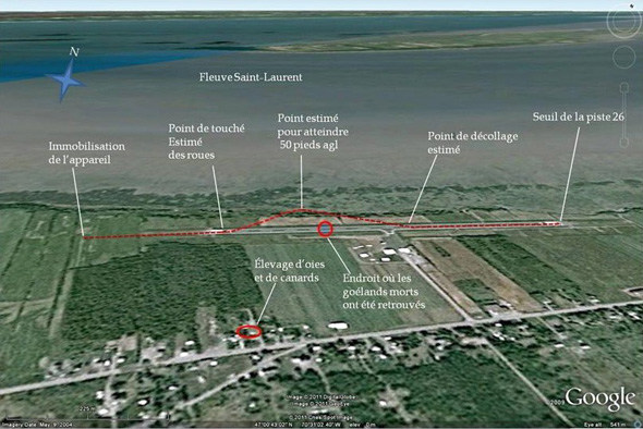 C'est lors de la mise en rotation qu'on observe la présence de nombreux oiseaux (environ 100 à 200) droit devant, à peu près dans le dernier quart de la piste. Les oiseaux s'envolent et forment soudainement un voile blanc. L'impact aviaire survient et le moteur gauche perd sa puissance alors que l'appareil a quitté le sol. L'altitude à laquelle l'impact aviaire et la perte de puissance sont survenus est estimée à moins de 50 pieds au-dessus du sol. Une vingtaine de goélands morts ont été retrouvés sur la piste à environ 1000 pieds avant le bout de piste.