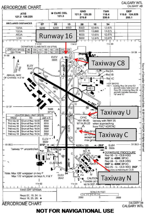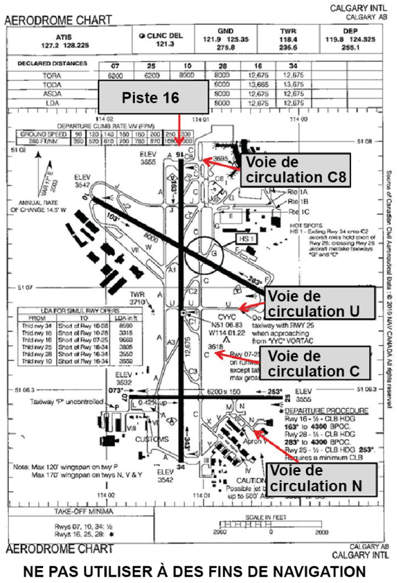 Le DHC-8-102, du vol NCB801, exploité par North Cariboo Flying Services Ltd., effectuait un vol nolisé entre Calgary et Edmonton (Alberta) en vertu d'un certificat d'exploitation émis conformément à la sous-partie 705 du Règlement de l'aviation canadien (RAC). NCB801 a quitté le hangar de North Cariboo, situé sur l'aire de trafic V, à 9 h. Il a reçu l'autorisation de rouler sur la voie de circulation N et d'attendre à l'écart de la voie de circulation C sur la piste 25 (voir l'annexe A). NCB801 est demeuré dans cette position pendant 7 minutes. À 9 h 04, le contrôleur sol a diffusé un message spécial à tous les aéronefs qui circulaient en vue d'un départ les enjoignant d'être patients, en leur assurant que leurs positions étaient connues et en leur demandant d'attendre d'autres instructionsFootnote 4. Vers 9 h 10, NCB801 a reçu l'autorisation de continuer à circuler au sol en direction nord sur la voie de circulation C vers la piste 16 et d'attendre à l'écart de la piste sur la voie de circulation U. À 9 h 12, le contrôleur d'aéroport en cause a reçu un exposé de transfert de poste de la part du contrôleur d'aéroport relevé et a été informé que le King Air du vol NCB236 de North Cariboo était en attente sur la voie de circulation U afin de franchir la piste 16 et de quitter à la voie de circulation A1 du côté ouest.