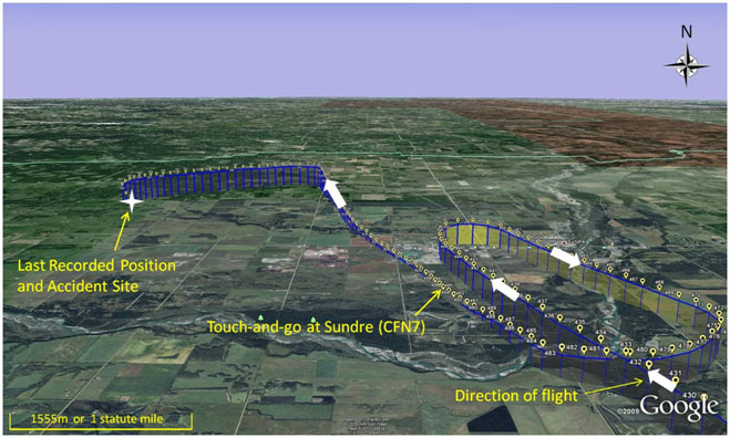 L'aéronef a quitté Springbank (CYBW) à 13 h 19Footnote 1, pour un vol d'une durée prévue de 1,5 heure. L'aéronef s'est dirigé vers le nord-ouest, à destination de l'aéroport de Sundre (CFN7), à 40 milles marins (nm) au nord de Springbank, à une altitude maximale de 6500 pieds au-dessus du niveau de la mer (asl), et à une vitesse sol maximale de 160 nœuds. Une descente a été amorcée à 21 nm au sud-est de CFN7. En raison de la dissimulation par le terrain, le dernier signal de retour de contrôle de la circulation aérienne produit par la source radar de Calgary, à 13 h 36, indique que l'aéronef C-FGLA descendait à une altitude de 5700 pieds asl.