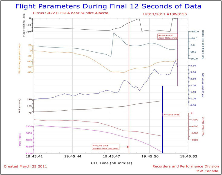 À ce moment, le cap diminuait en passant par 120° M, la vitesse indiquée était de 103 nœuds et l'aéronef affichait un taux de descente verticale de plus de 5000 pieds par minute (pi/min), les charges positives dans l'axe vertical étant alors de 2,4 g. À 13 h 45 min 51 s, les dernières données enregistrées indiquaient que l'aéronef se trouvait à 160 pieds, sur le plan latéral, du point d'impact. La vitesse indiquée augmentait à 132 nœuds tandis que le taux de descente verticale augmentait à 6900 pi/min et l'accélération verticale atteignait approximativement 3,5 g. Le moteur tournait tout au long de la descente vers le sol.