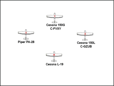 Le Cessna 150G (C-FVXY), le chef du vol en formation, comptait 2 occupants. À sa droite, en position numéro 2, se trouvait le Cessna 150L (C-GZUB) avec son pilote comme seul occupant. Le Piper PA-28-180, également avec 2 occupants, était en position numéro 3 à la gauche du chef de formation. Le Cessna 305A (L-19), avec le pilote seul à bord, occupait la position numéro 4 derrière les 3 autres aéronefs.