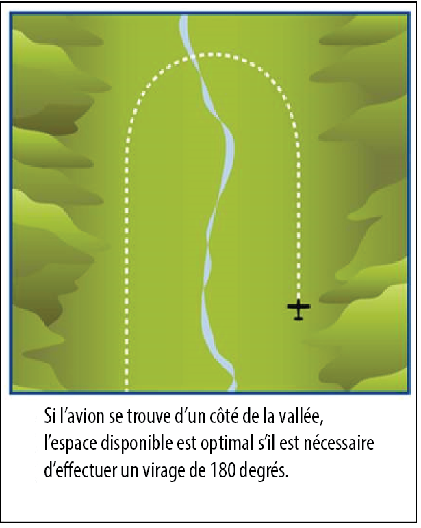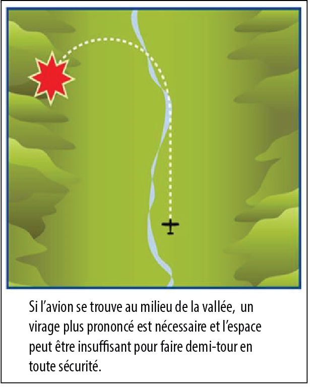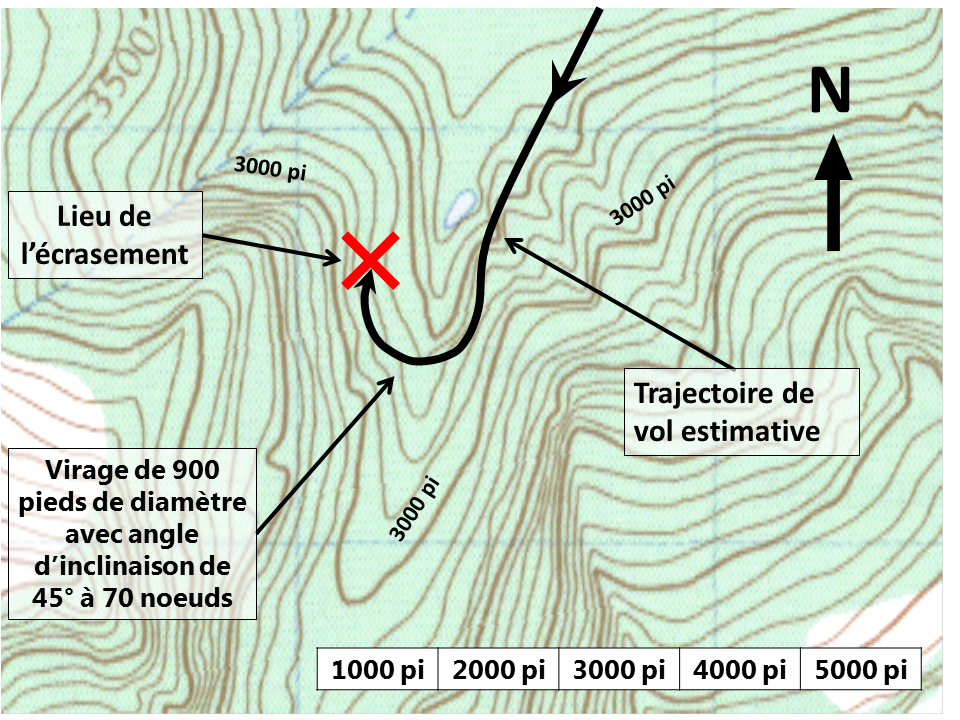 La largeur du col au-dessus du lieu de l’accident est d’environ 1700 pieds. À l’altitude du col et à une vitesse de manœuvre type de 70 nœuds (vitesse indiquée), l’aéronef aurait eu besoin d’une distance latérale d’environ 900 pieds pour faire demi-tour avec une inclinaison de 45°. La distance latérale n’était suffisante pour effectuer ce virage que s’il était amorcé lorsque l’appareil se trouvait à proximité de l’une ou l’autre des parois du canyon. Si le virage était amorcé à partir du centre du canyon, l’angle d’inclinaison nécessaire entraînerait un risque de décrochage ou de collision avec la paroi du canyon.