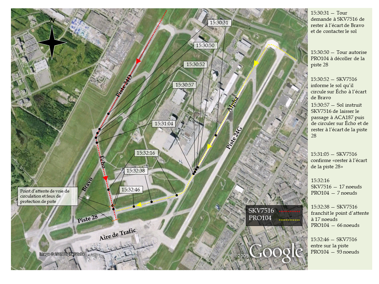 Un Bombardier DHC-8 (portant l’immatriculation C-FSRY et le numéro de série 4174), exploité sur le vol SKV7516 de Sky Regional Airlines Inc. en provenance de Toronto (Ontario), atterrit sur la piste 24R de l’aéroport international Pierre-Elliott-Trudeau de Montréal (Québec). Le contrôleur sol demande à l’équipage de circuler sur la voie de circulation Écho et d’attendre à l’écart de la piste 28, instruction que le SKV7516 a collationnée correctement. Au moment où le SKV7516 emprunte la voie Écho, le contrôleur d’aéroport autorise un Beech A100 King Air (portant l’immatriculation C-GJLJ et le numéro de série B-235), exploité sur le vol PRO104 de Propair Inc., à décoller de la piste 28. Environ 2 minutes plus tard, le SKV7516 arrive au point d’attente de la piste 28, et s’engage sur la piste 28 sans s’arrêter. Le PRO104, qui est alors en voie d’atteindre la vitesse de rotation, interrompt son décollage dès qu’il aperçoit le SKV7516 sur la piste. Le PRO104 bifurque à droite de l’axe de piste et passe à quelque 40 pieds derrière le SKV7516. L’événement s’est produit de jour vers 15 h 33, heure avancée de l’Est.