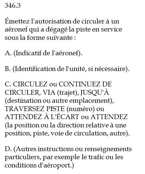 Les contrôleurs doivent appliquer les règles, les procédures et les minimums d’espacement pour le contrôle de la circulation aérienne, conformément au Manuel d’exploitation du contrôle de la circulation aérienne de NAV CANADA (MANOPS ATC). Le contrôleur sol a autorisé le SKV7516 à circuler en conformité avec l’article 346.3 du MANOPS (figure 2). Le contrôleur sol n’était pas tenu d’aviser SKV7516 que PRO104 avait été autorisé à décoller de la piste 28. Les renseignements concernant le trafic décrits dans la partie D du paragraphe 346.3 sont fournis uniquement si le contrôleur les juge appropriés.