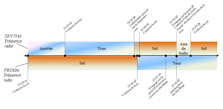 Les enregistrements audio permettent d’établir la fréquence radio utilisée par les équipages de chacun des appareils durant un événement (figure 3). Toutefois, ces enregistrements ne permettent pas de déterminer le moment précis des changements de fréquences à bord des appareils. En conséquence, l’enquête n’a pu déterminer la fréquence que syntonisait le SKV7516 au moment où le contrôleur de l’aéroport a autorisé le PRO104 à décoller de la piste 28.
