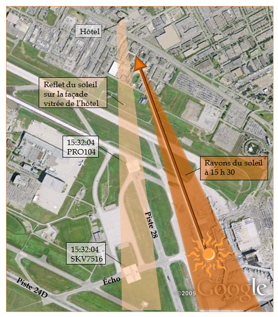 - Les rayons du soleil se reflétaient sur la fenestration d'un édifice situé en arrière-plan du seuil de la piste (figure 4).