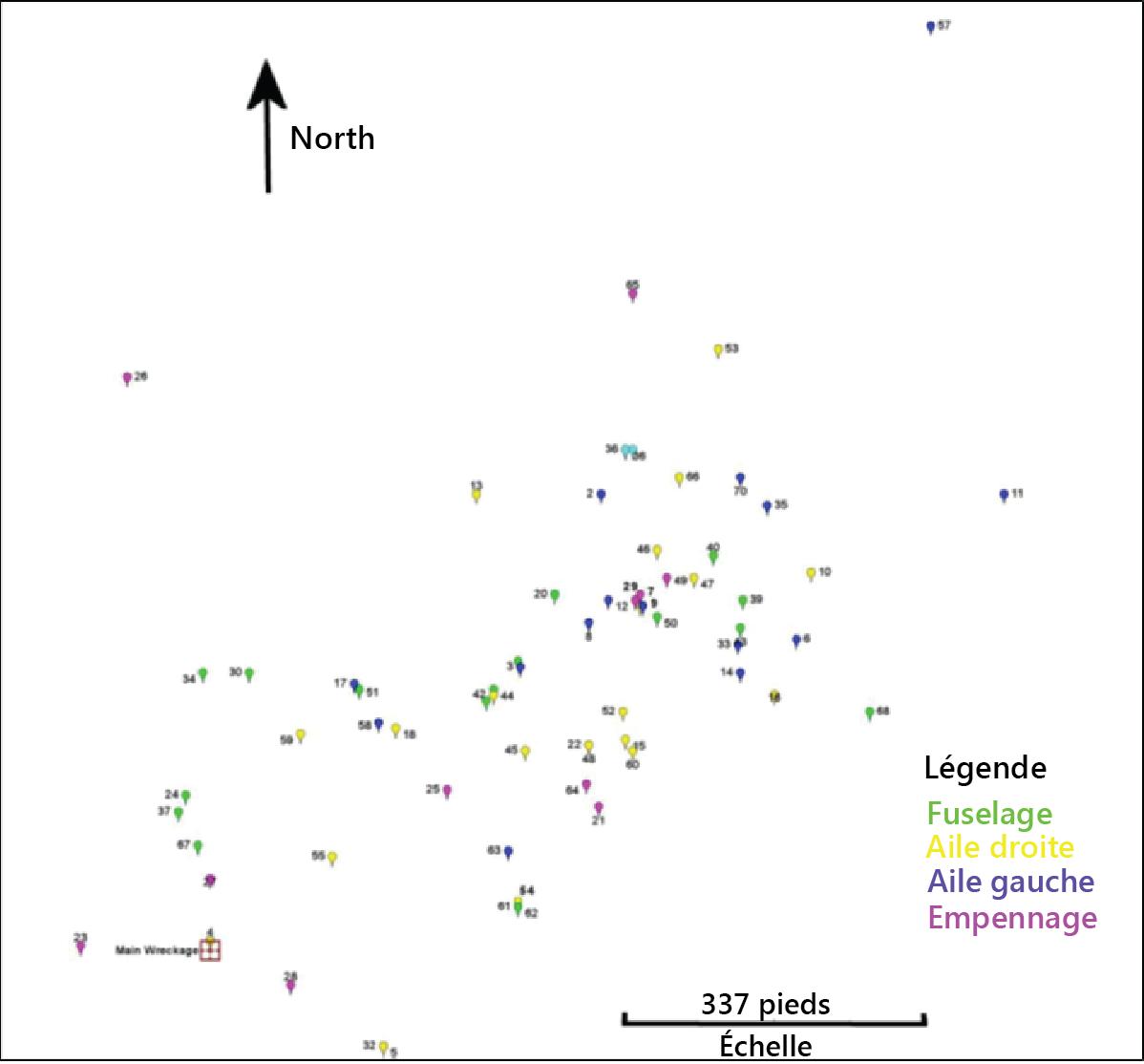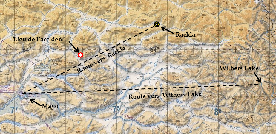 Le pilote est arrivé à l’aéroport de Mayo vers 6 h 30Note de bas de page 1 le matin de l’accident et a décollé de Mayo à 8 h 34 pour son premier voyage de la journée à destination de Withers Lake. Le pilote a effectué 2 voyages à Withers Lake et 1 voyage à Rackla avant le vol ayant mené à l’accident. Le vol en question a décollé de Mayo à 14 h 48 selon les règles de vol à vue (VFR) et suivait un itinéraire de vol de la compagnie. À 15 h 07, le Centre canadien de contrôle des missions (CCCM) a capté une alerte d’une radiobalise de repérage d’urgence (ELT) de 406 MHz. Le centre conjoint de coordination de sauvetage de Victoria (JRCC Victoria) en a été avisé à 15 h 22. Les aéronefs volant dans la région ont été avertis, et un hélicoptère commercial a été envoyé de Ross River (Yukon) à la recherche de l’aéronef environ 1 heure plus tard. À 18 h 33, l’équipage de l’hélicoptère a trouvé l’épave de l’aéronef à quelque 4300 pieds au-dessus du niveau la mer (asl), sur le flanc d’une colline éloignée recouverte de neige, à 38 milles marins (nm) au nord-est de Mayo.