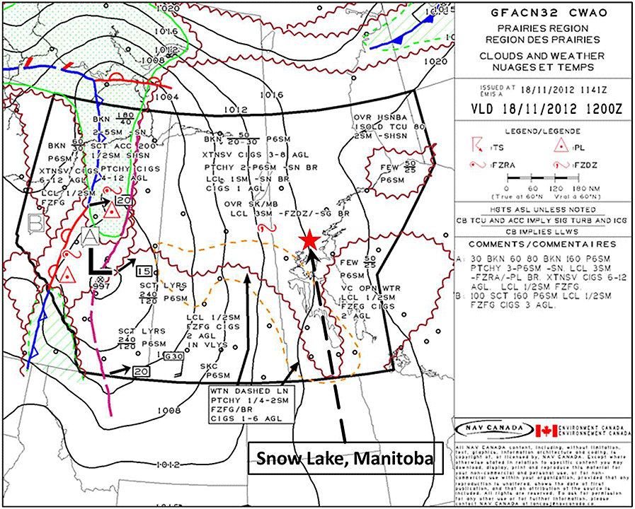 La carte « nuages et temps » de la GFA pour le 18 novembre 2012 à 6 h, de 6 h à 12 h UTC (annexe B), indiquait que la zone était touchée par un système dépressionnaire centré au-dessus du centre de l'Alberta qui a entraîné la formation de nuages denses au-dessus du centre du Manitoba, avec des plafonds étendus de 300 à 500 pieds agl, une visibilité de 2 à 6 sm dans des conditions de neige, de neige légère et de bruine, des plafonds locaux de 100 à 300 pieds agl et une visibilité de 1 à 3 sm dans des conditions de neige, de bruine verglaçante légère, de flocons de neige et de bruine. La GFA (annexe C) prédisait des conditions locales et intermittentes de givrage mixte et modéré dans les nuages de 3000 pieds à 5000 pieds agl, et de la glace transparente à partir du sol jusqu'à 3000 pieds agl dans des conditions locales de bruine verglaçante. Le point de congélation se trouvait au sol.