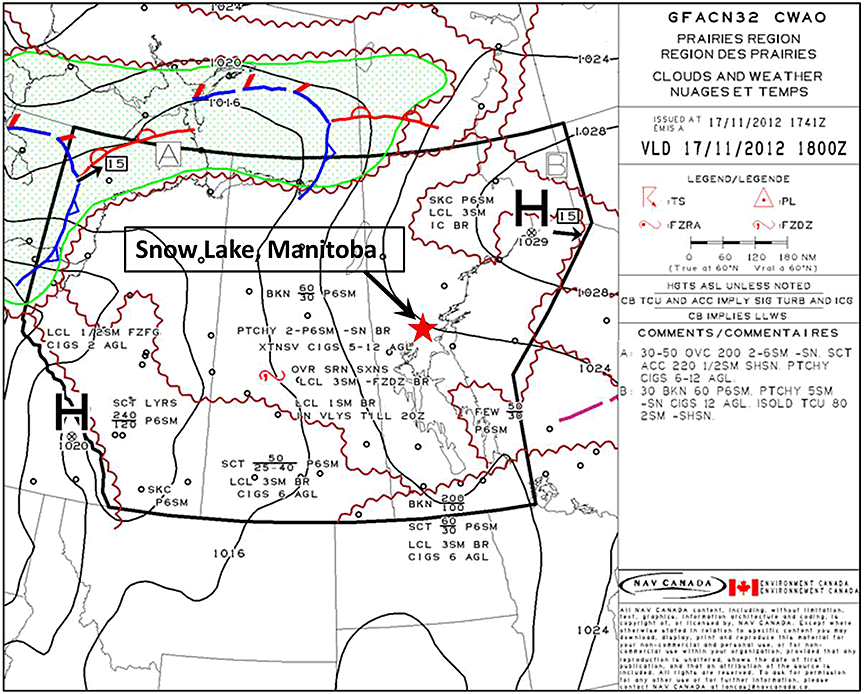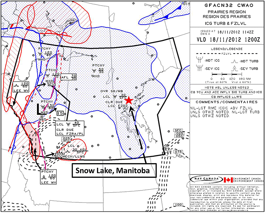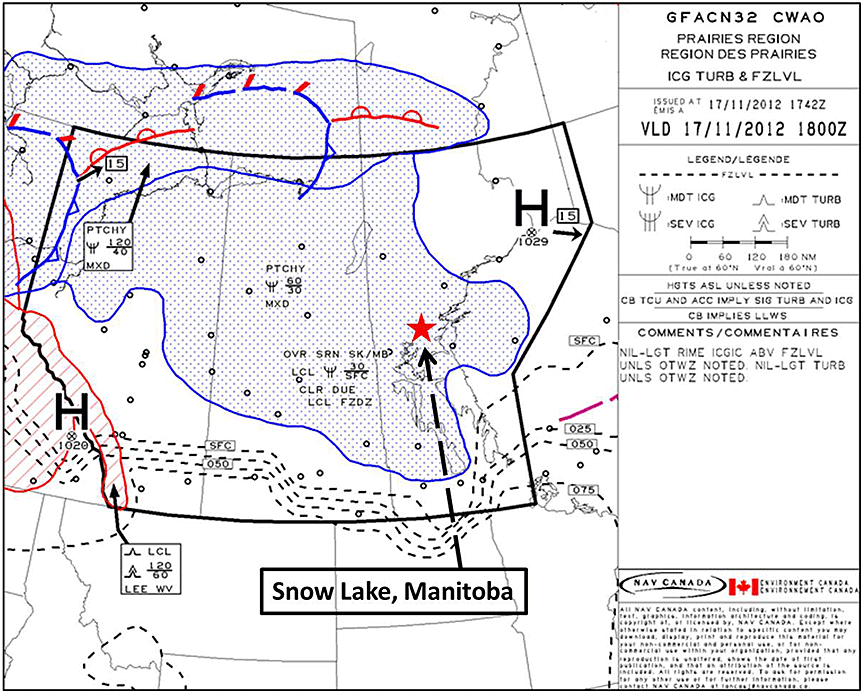 Le 17 novembre 2012 à 12 h, temps universel coordonné (UTC), la carte « nuages et temps » de la prévision de zone graphique (GFA) (annexe D) et la carte représentant les conditions de givrage et de turbulence ainsi que le niveau de congélation (GFA)(annexe E) prédisaient des bases nuageuses à 3000 agl, ainsi que des bases nuageuses, par endroits, de 1200 pieds agl, pour la trajectoire du vol allant de Winnipeg à Snow Lake. Des conditions de givrage mixte et modéré dans les nuages entre 3000 pieds et 6000 pieds agl étaient prévues, et dans le secteur sud du vol, la présence intermittente de glace transparente dans des zones isolées de bruine verglaçante était prévue.