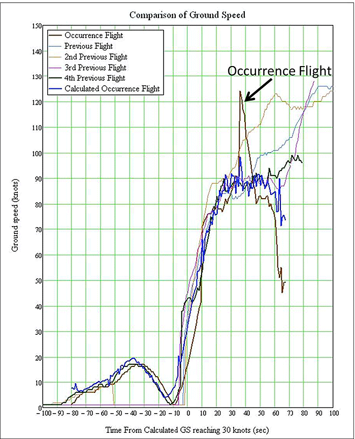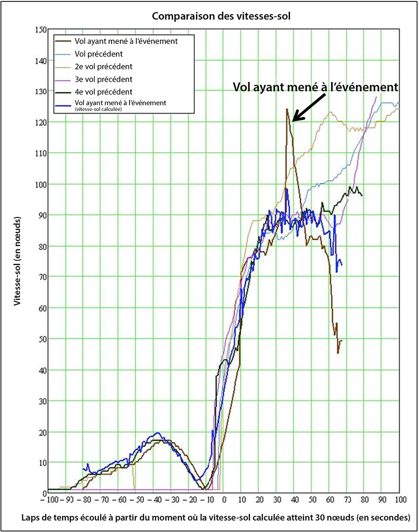 Annexe F – Comparaison de la vitesse-sol observée au cours du vol ayant mené à l'accident à la vitesse-sol enregistrée dans le cadre des quatre vols précédents
