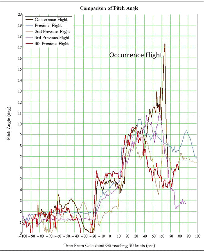 L'information récupérée indiquait que l'estampille temporelle n'était pas la même sur les 2 fichiers journal des unités d'affichage; ainsi, il n'a pas été possible d'établir de corrélation temporelle directe entre les 2 fichiers. Un alignement et une comparaison des 2 ensembles de données ont permis de déterminer qu'il n'existait que de légères différences entre les données des 2 fichiers. Compte tenu des irrégularités observées dans les vitesses enregistrées de l'aéronef, l'utilisation de ces vitesses aux fins d'analyse posait problème. Il a été établi que la latitude et la longitude de l'aéronef étaient exactes; ces données ont donc été utilisées dans le calcul de la distance parcourue et des vitesses de l'aéronef. Dans l'annexe G, la vitesse-sol calculée enregistrée au cours du vol en cause est comparée à la vitesse-sol calculée observée au cours des 4 vols précédents. Les vitesses calculées ne présentaient pas les anomalies découlant des irrégularités que l'on retrouvait dans les vitesses enregistrées. Les 2 unités d'affichage ont enregistré l'angle de tangage de l'aéronef. L'annexe F présente une comparaison des angles de tangage enregistrés au cours du vol en cause et des angles de tangage enregistrés au cours des 4 vols précédents. La vitesse corrigée a été utilisée au cours de l'examen de l'information tirée des systèmes d'instruments de vol électroniques, car les erreurs dans la vitesse indiquée en nœuds ou les écarts momentanés par rapport à cette dernière n'ont pas été enregistrés.
